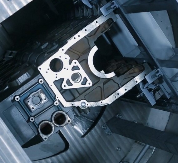 Material handling: The cylinder block is unloaded through a motorized roller conveyor and a lifting device.