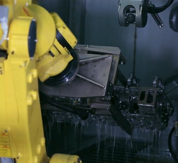 Cleaning: The ground rail robot holds the workpiece and places it on the fixtures in each cleaning chamber for overall and turbulent cleaning. The small robot holds the nozzle for fixed-point cleaning. Oil passage cleaning and water jacket cleaning are also performed.